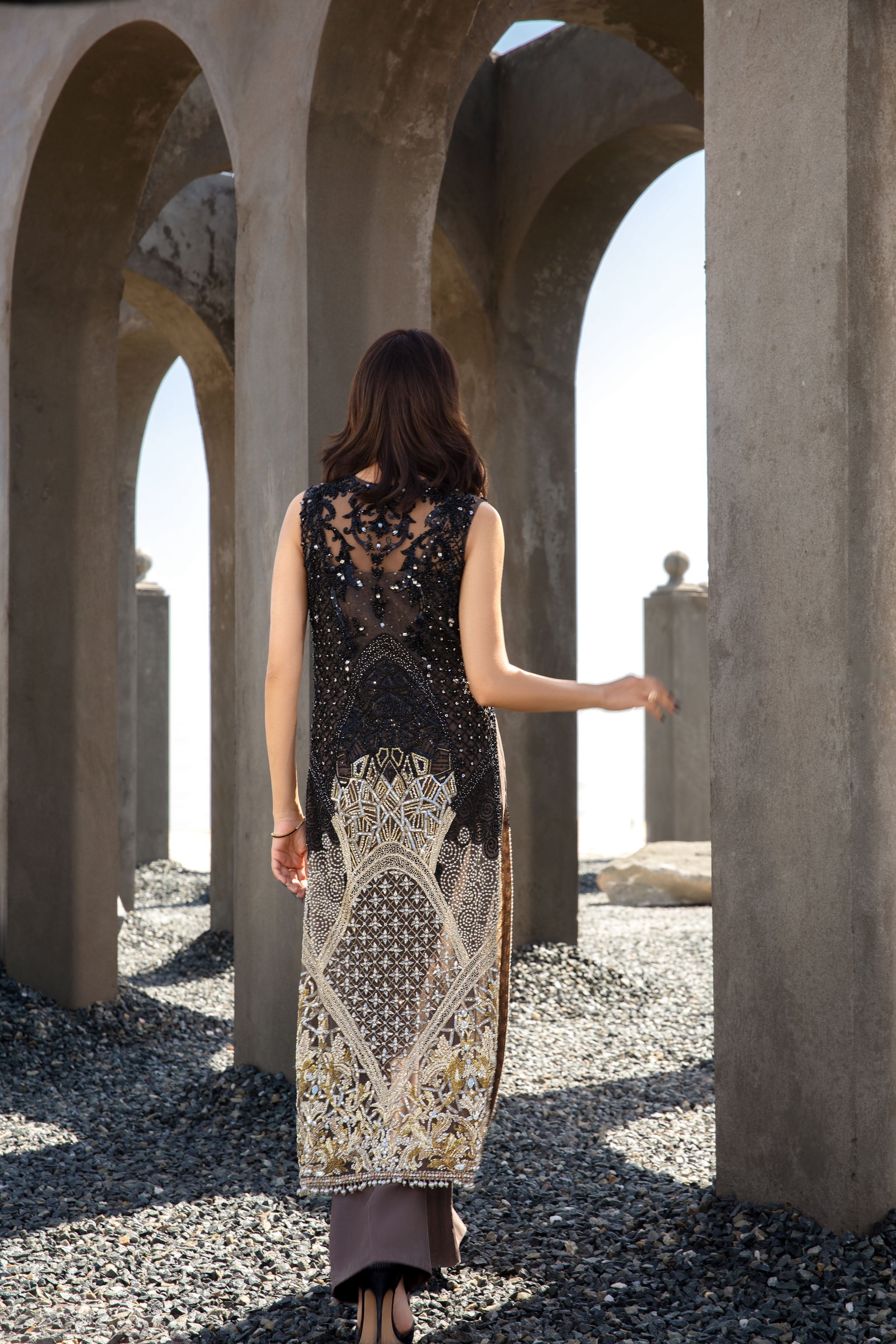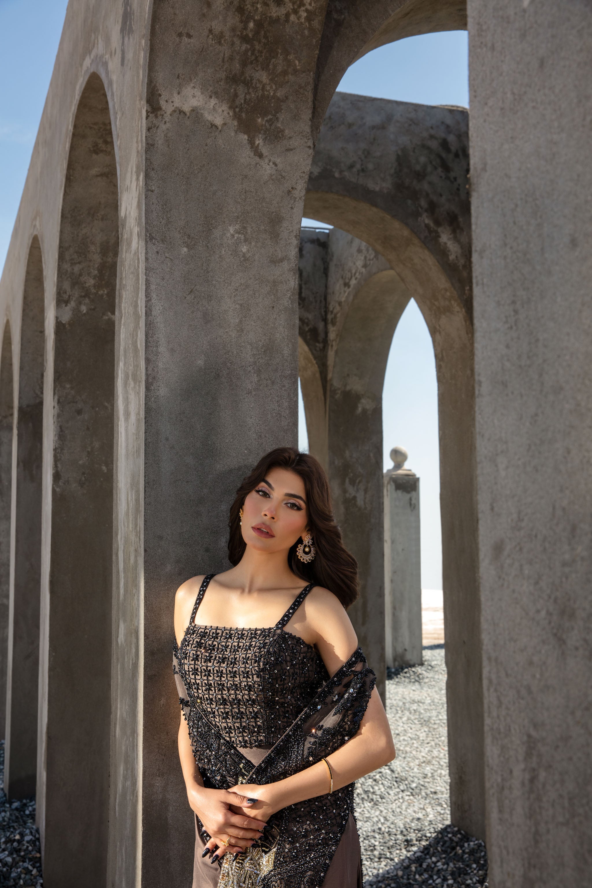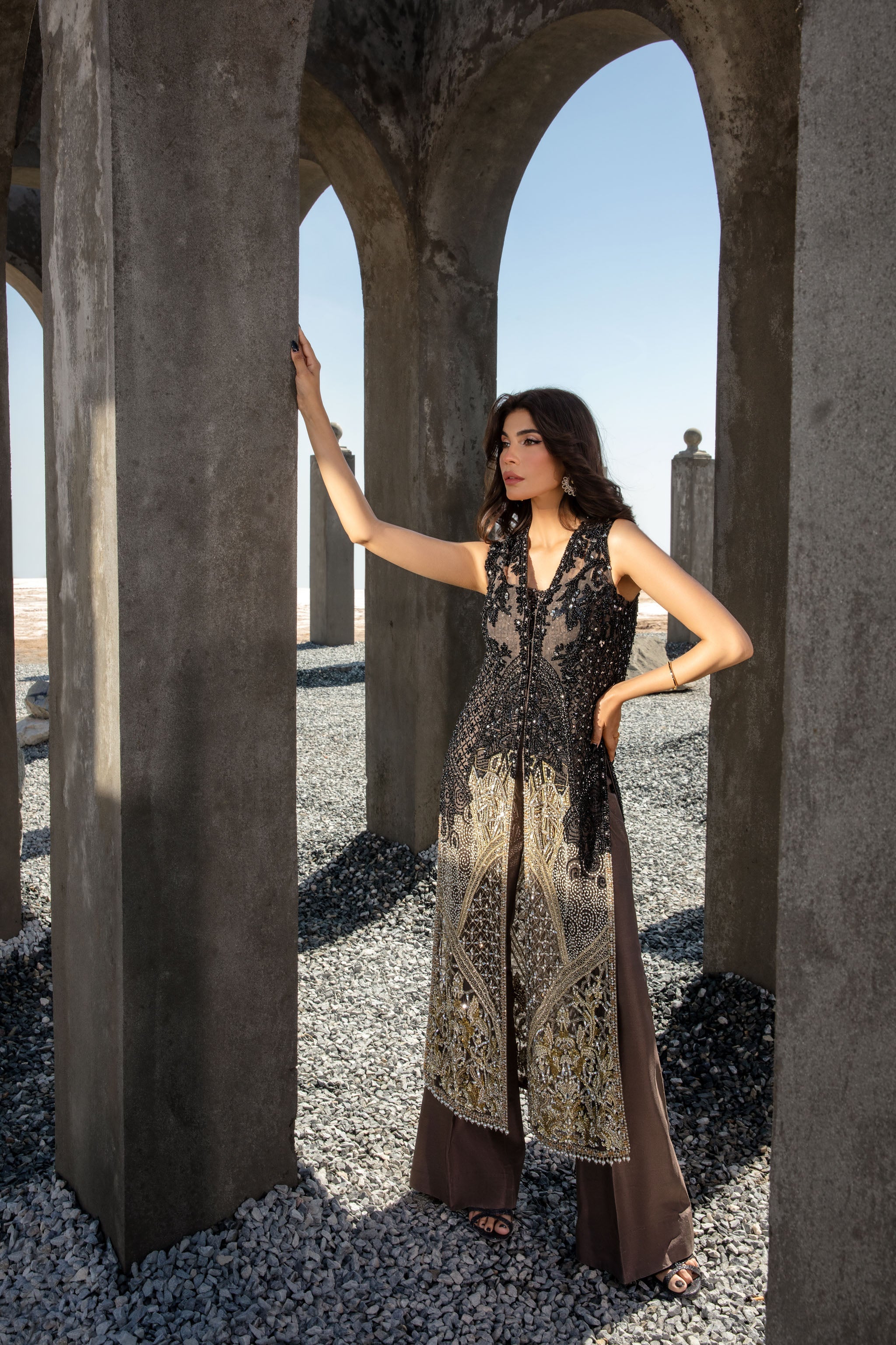 Elevate your formal wardrobe with our Embellished Brown Three-Piece Formal Set, a meticulously crafted ensemble that exudes sophistication and grace. This stunning gown features a deep brown shade, adorned with intricate geometric patterns and luxurious black pearls. The outfit is further enhanced by black sequins, gold sequins, and sparkling Swarovski crystals, creating a visually captivating effect. Cut stones and chain stones add an extra layer of opulence and detail, making this three-piece set perfect for any formal occasion.