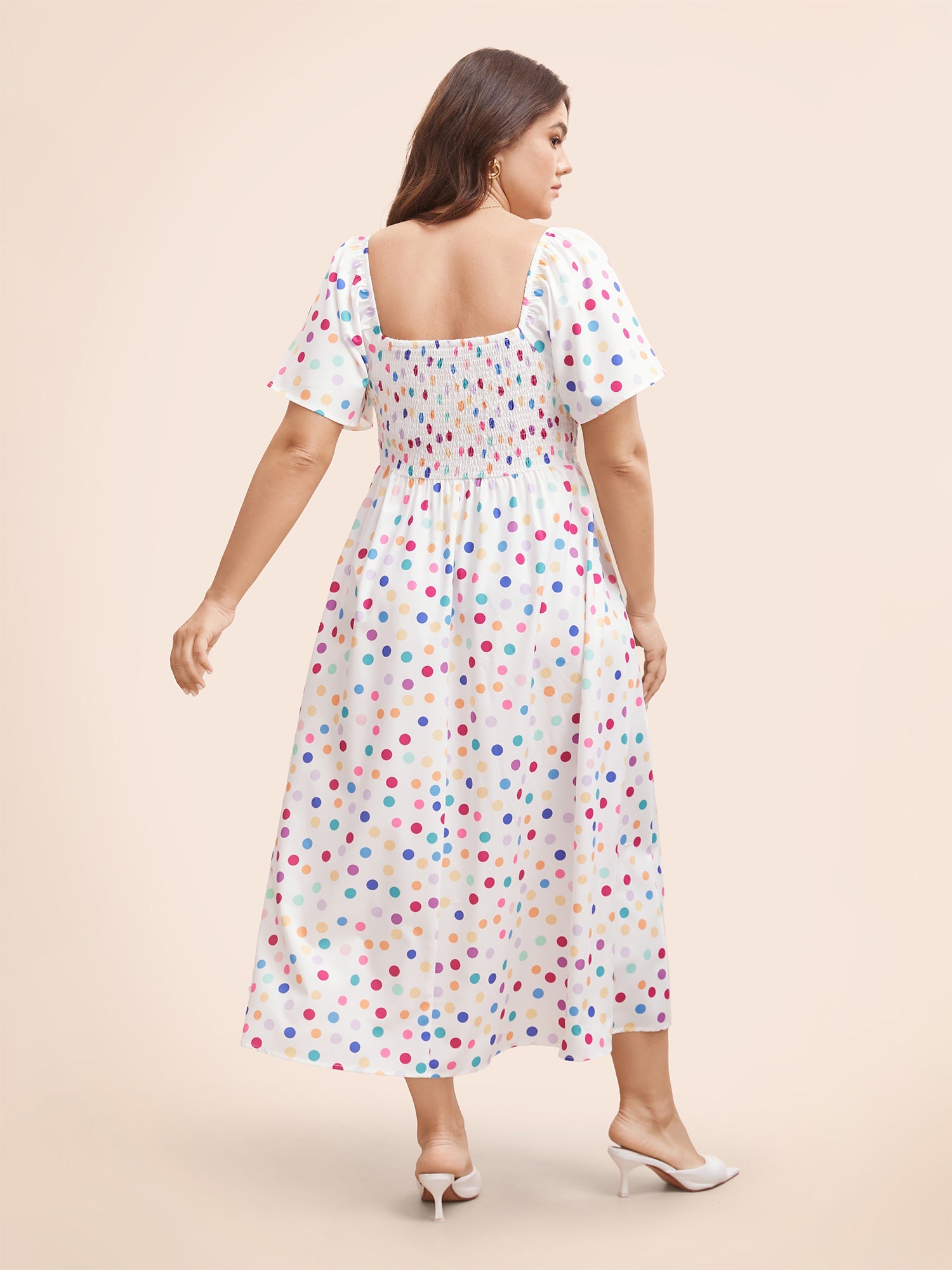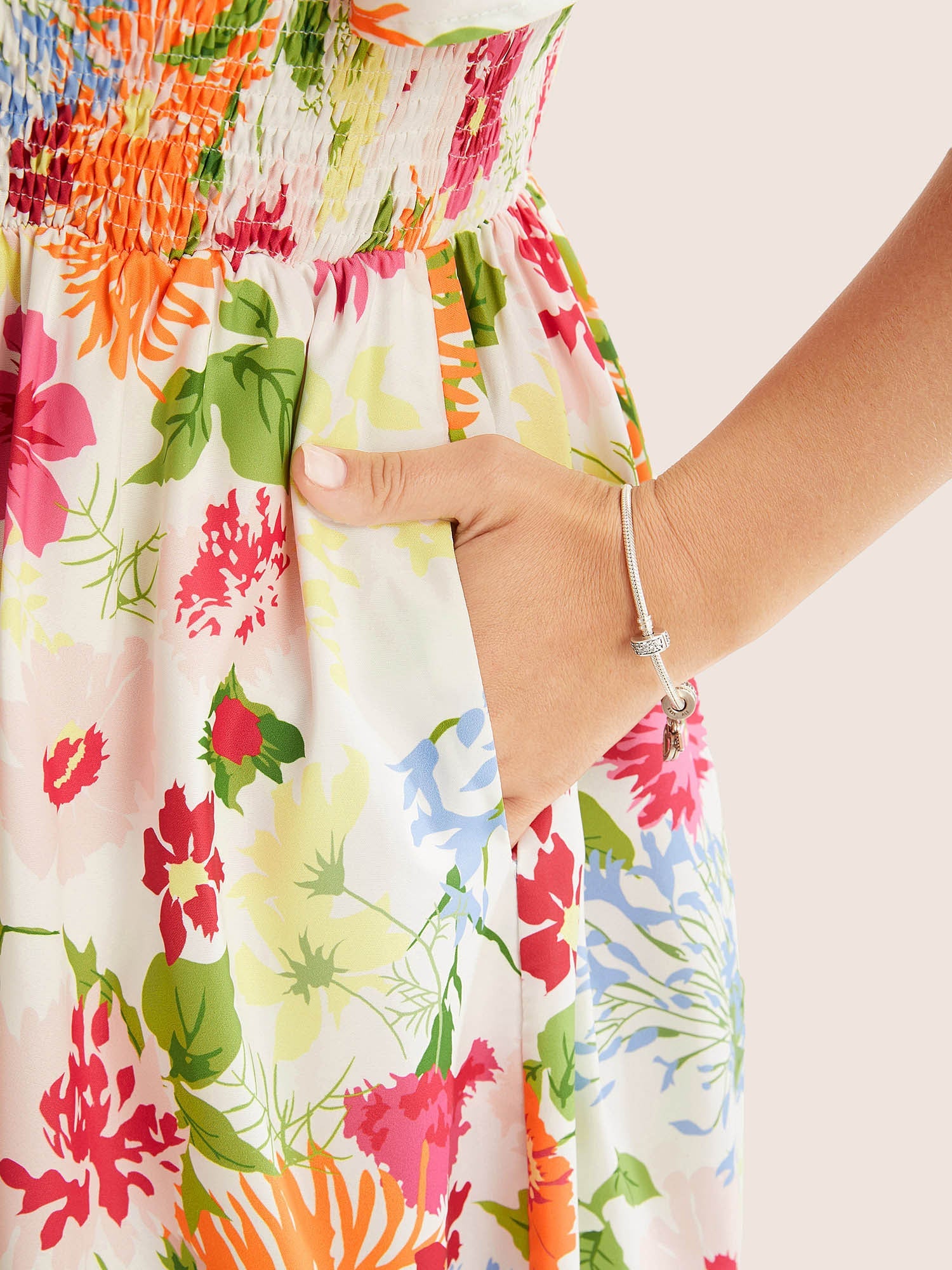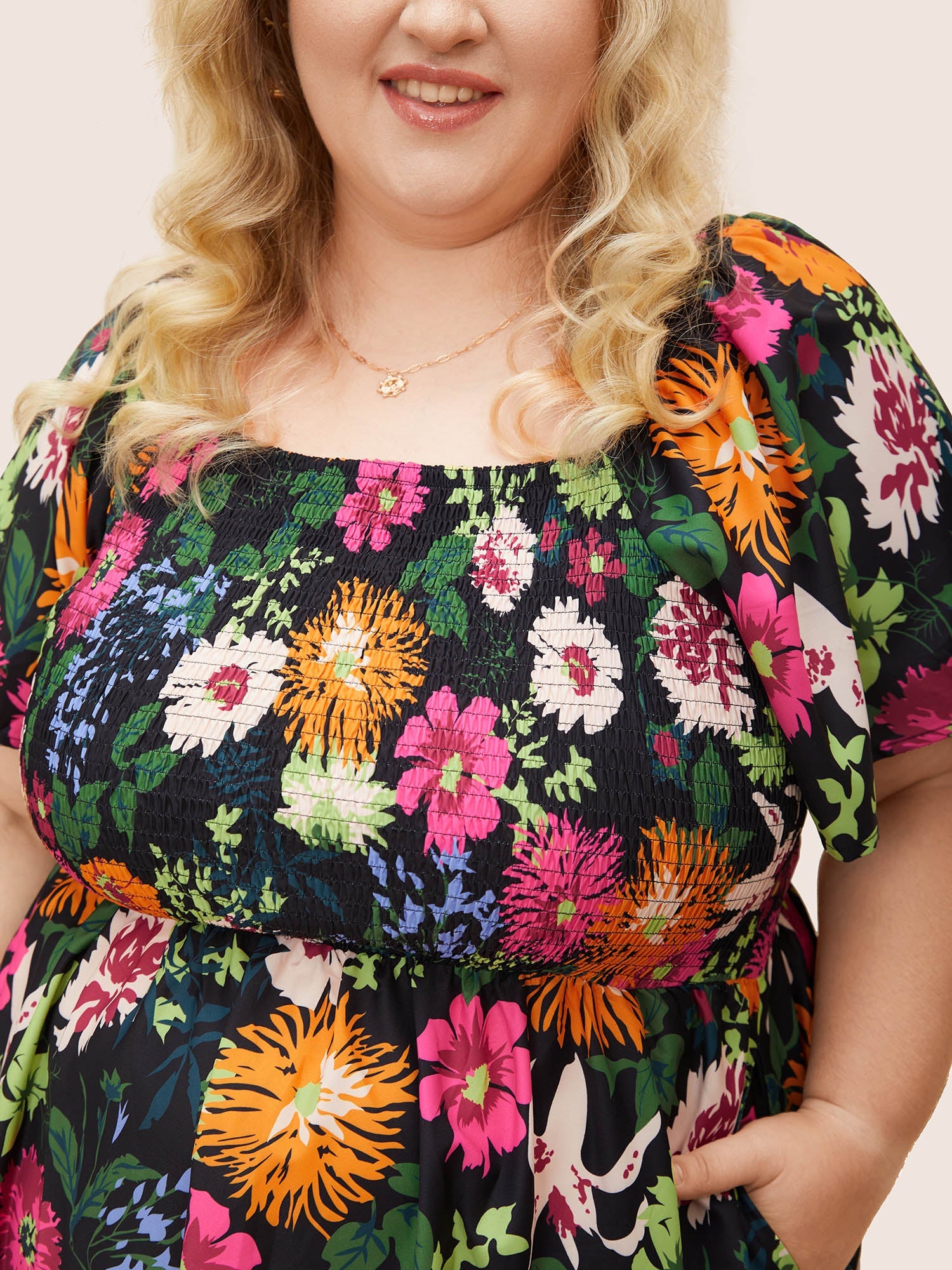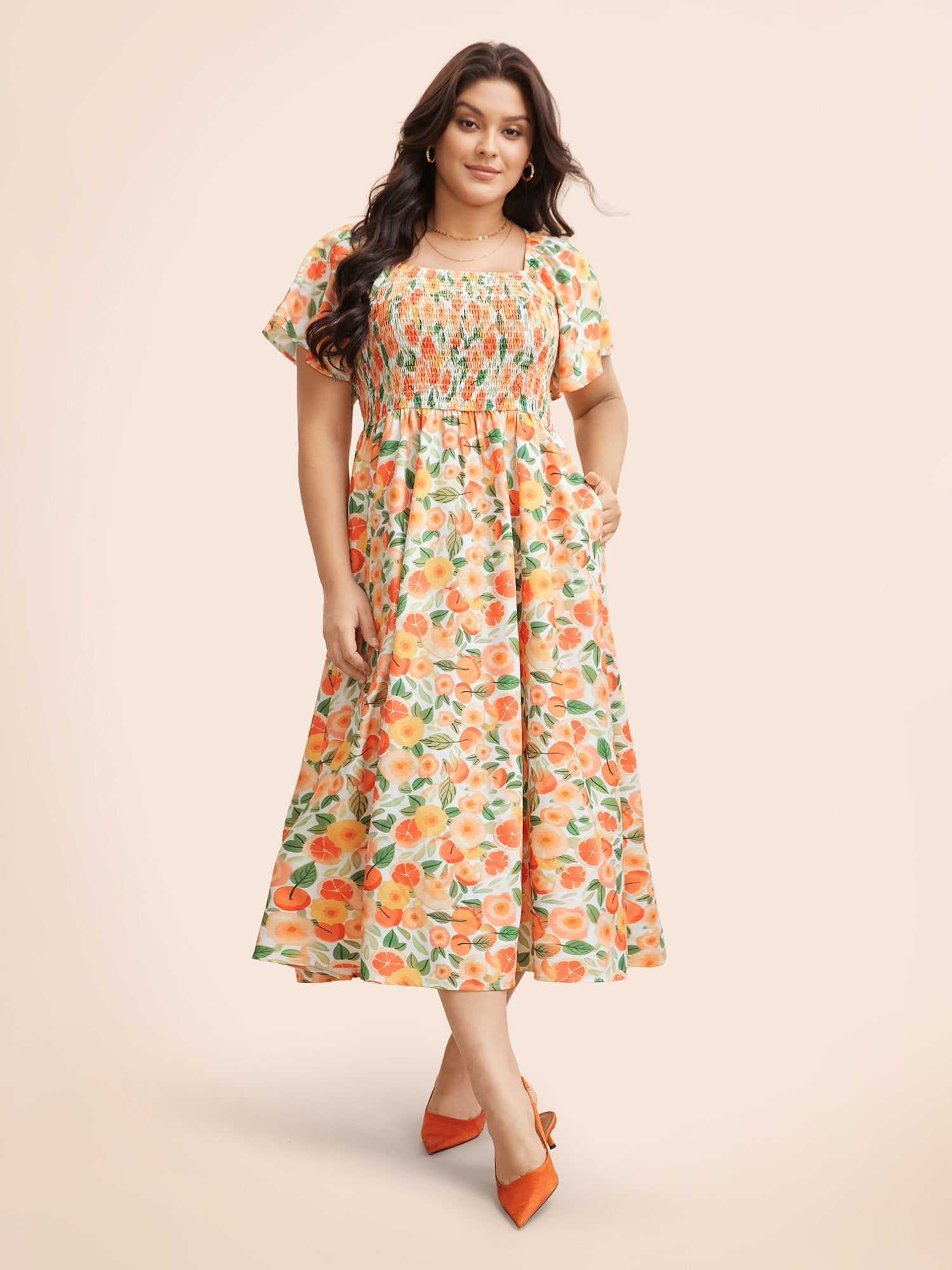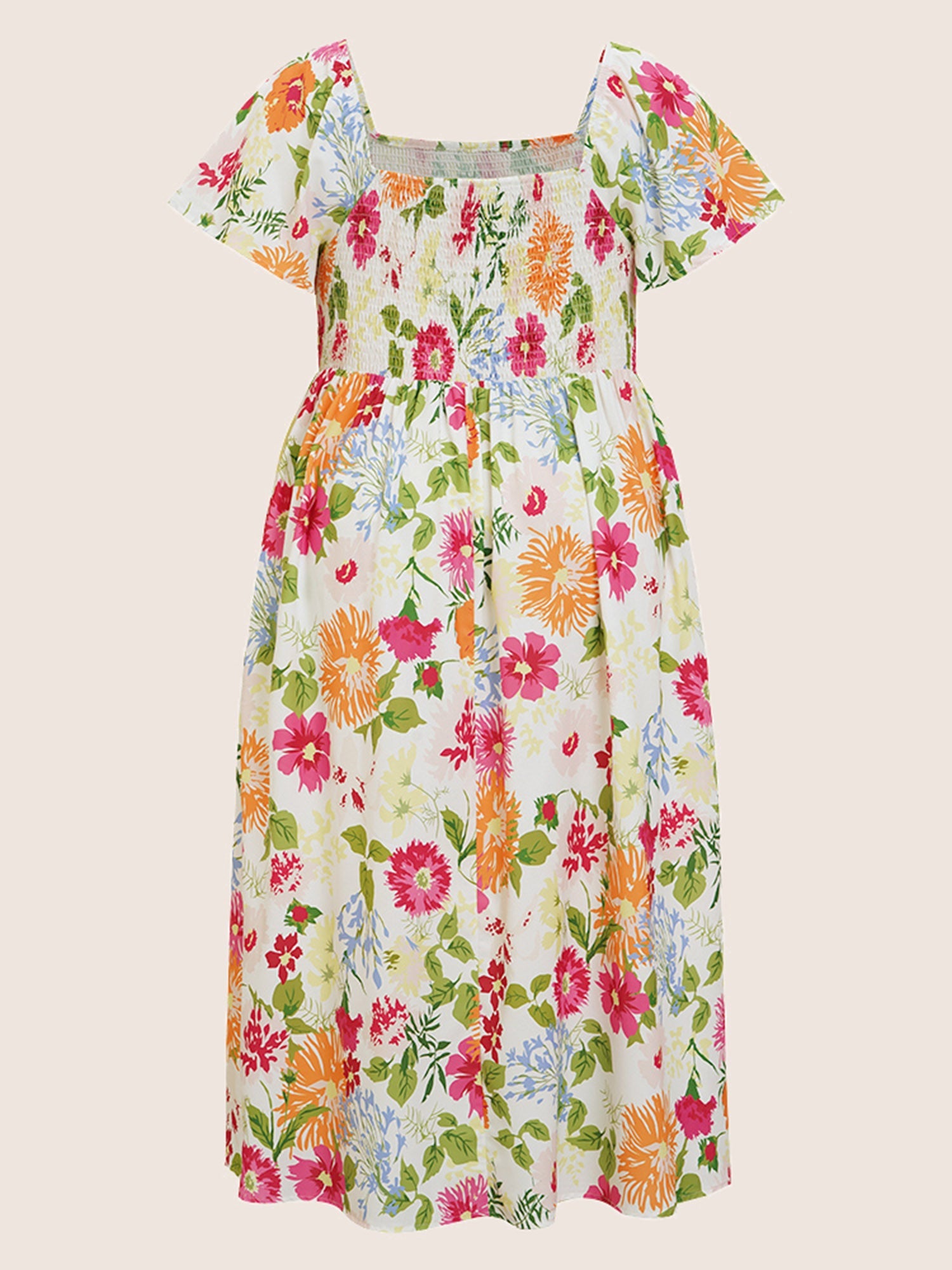 Floral Shirred Square Neck Pocket Midi Dress