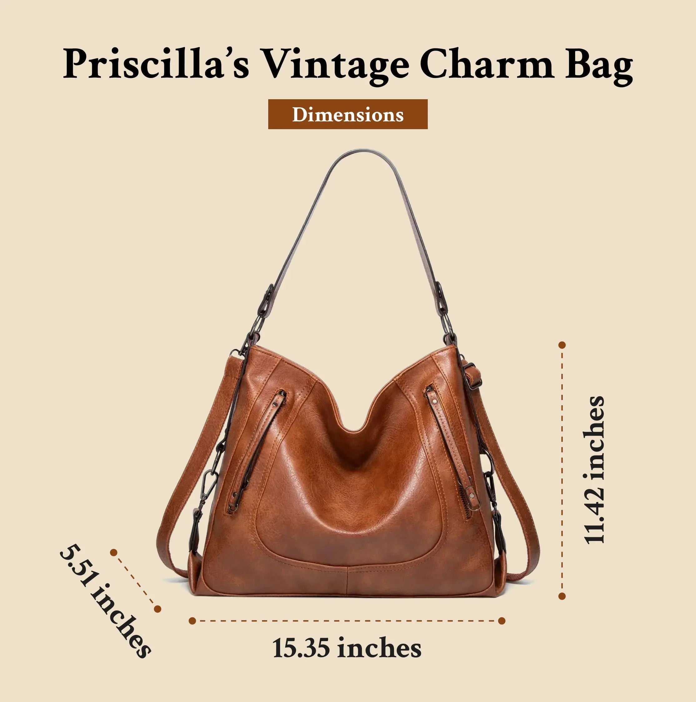 - Premium Leather Construction: Priscilla’s Vintage Charm is crafted from high-quality leather, providing both durability and a refined appearance. This bag is perfect for everyday use and special occasions, making it a versatile addition to your wardrobe.