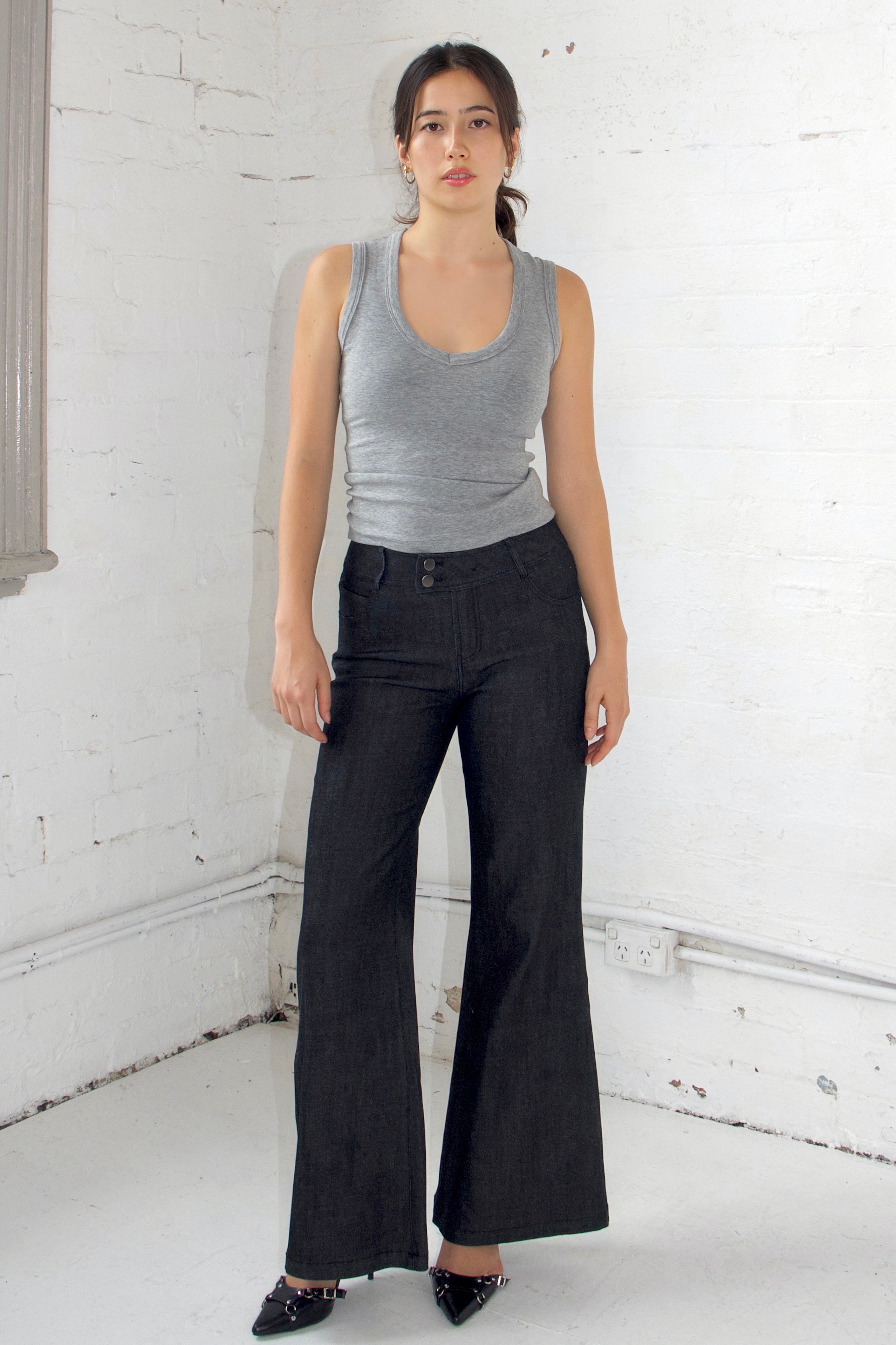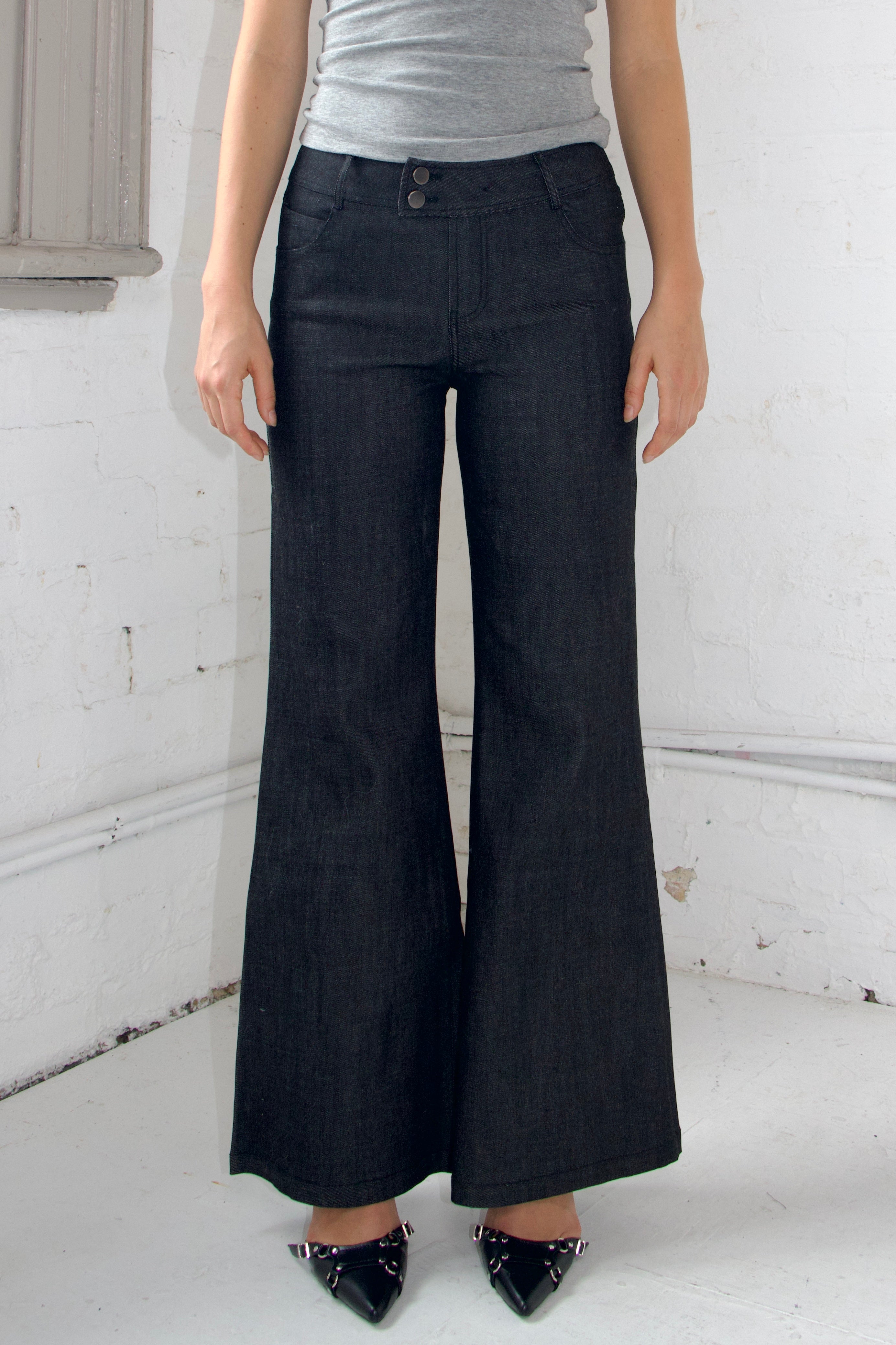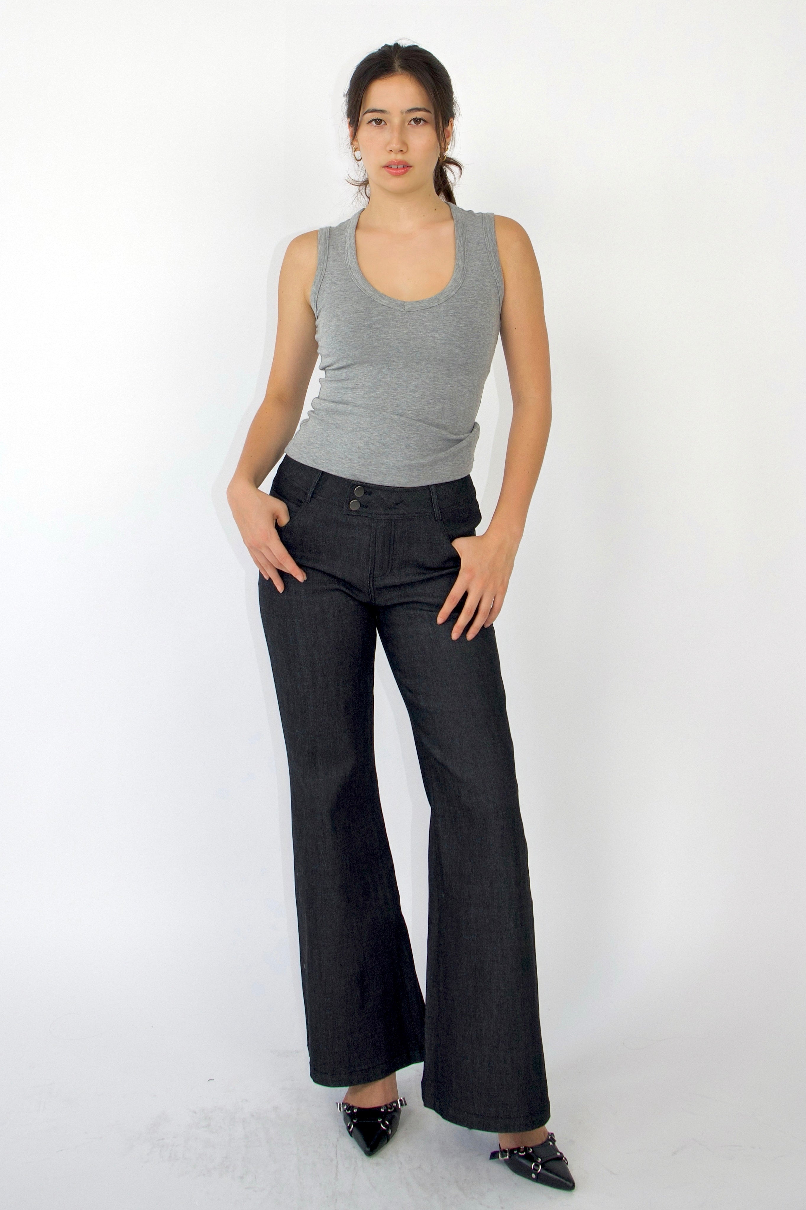 These jeans feature a low-waisted, wide-leg fit crafted from stretch denim, delivering a perfect blend of style and comfort. Inspired by early 2000s fashion, they showcase minimal detailing and a double-button waistband, adding a subtle retro vibe. Versatile enough for both casual and dressed-up occasions, these jeans effortlessly bring a nostalgic yet modern edge to any outfit.