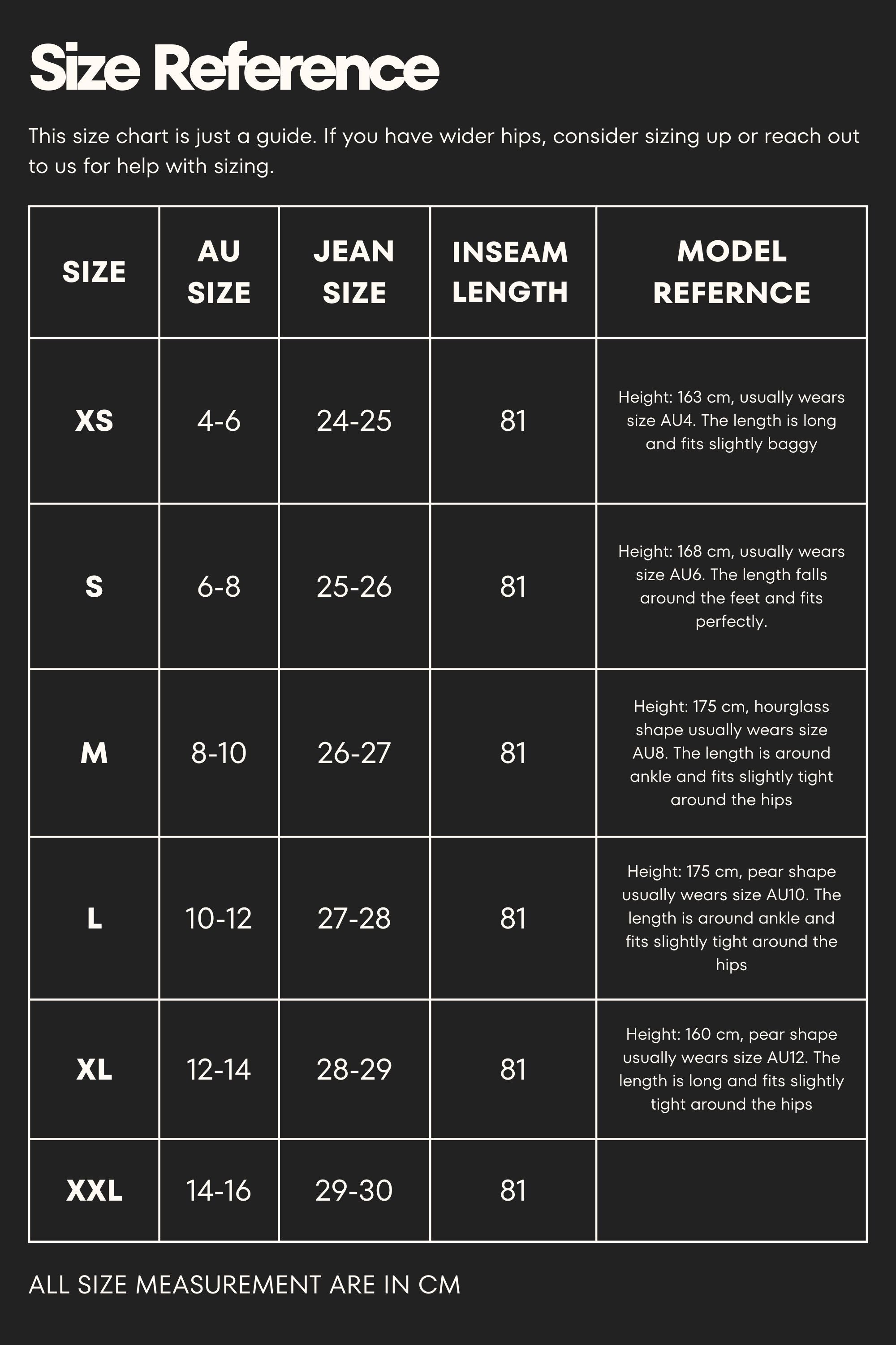 XL: Lower waist = 86 cm, hip= 100-108 cm,thigh = 86 cm, length = 105 cm, fit size 30-31, AU 12-14
