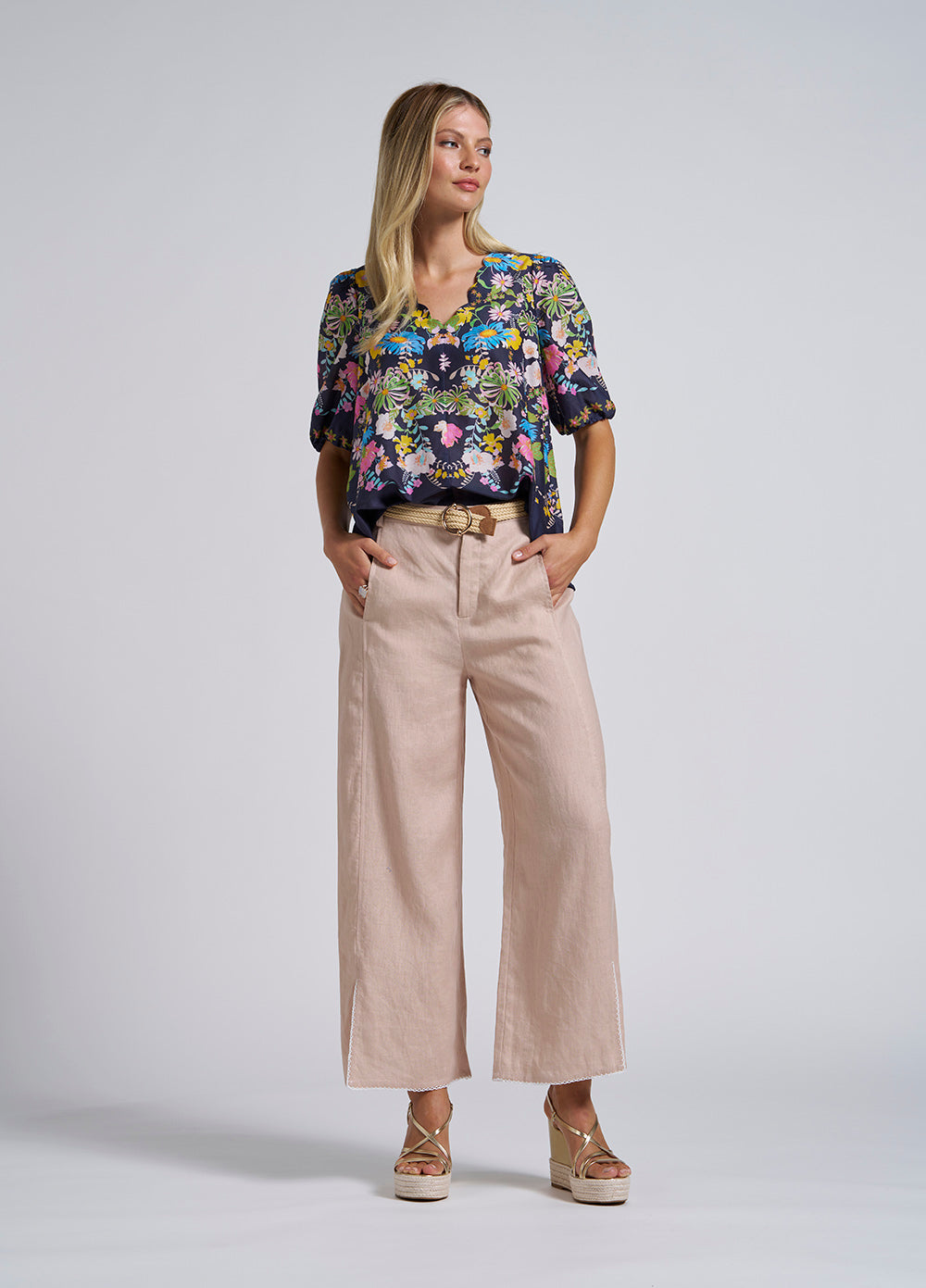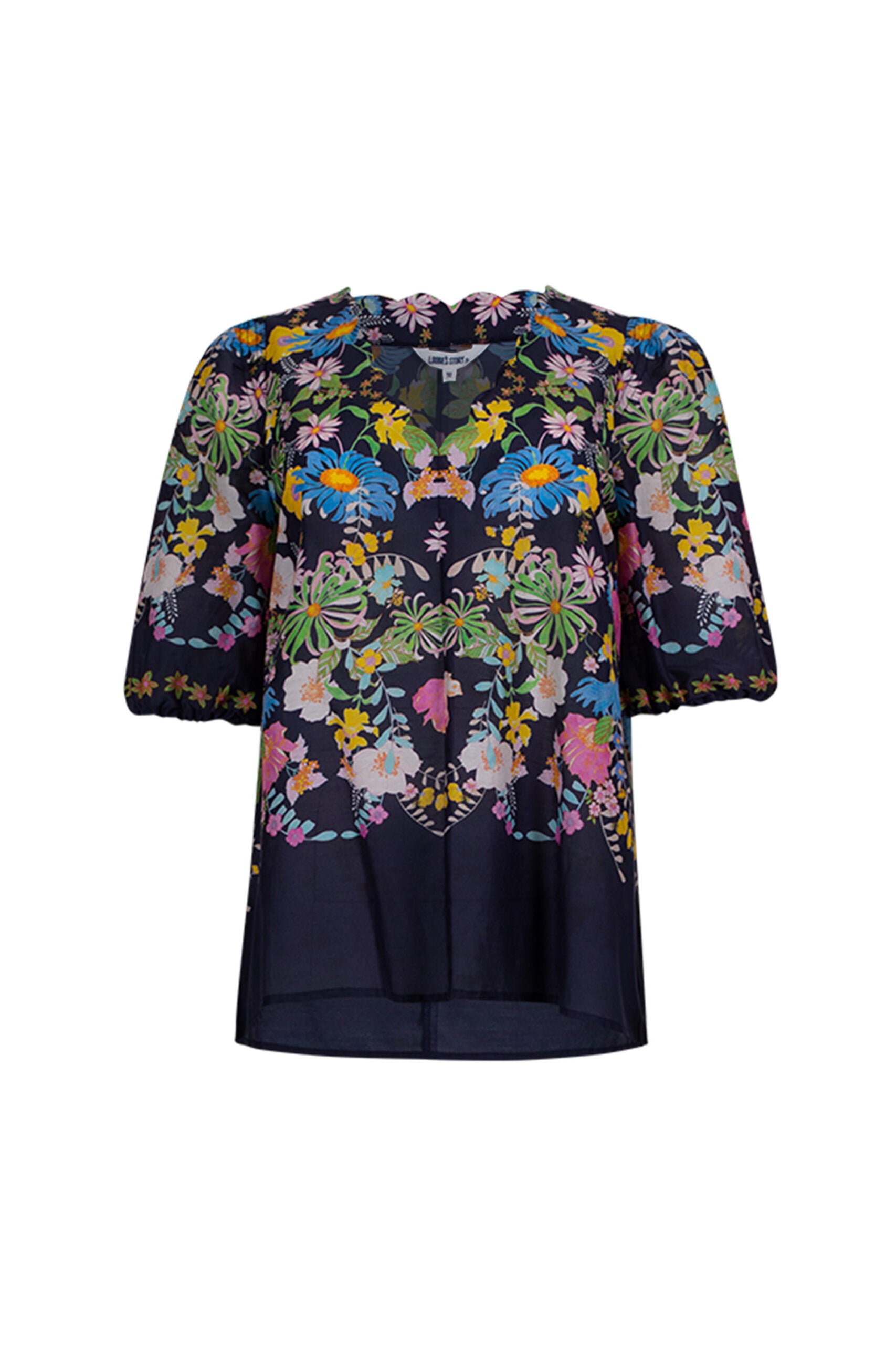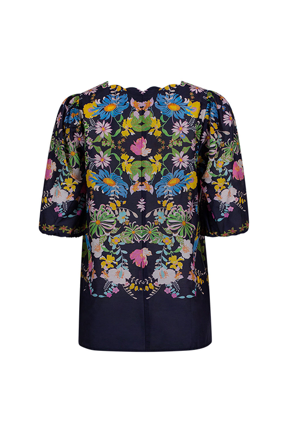 This Floral Style Top combines comfort and style in one beautifully crafted piece. Made from a luxurious silk cotton blend, it features a scalloped V-neckline, blouson sleeves with hidden elastic cuffs, and a stunning mirrored print design at the center. Perfect for any occasion, it brings a sophisticated touch to your wardrobe.