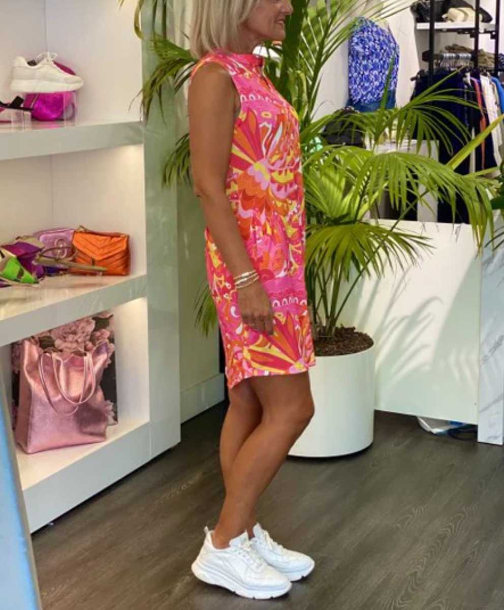 The Tamsin™ Sleeveless Dress is the ultimate solution to elevate your summer wardrobe. Its flattering V-neck and playful sleeveless design add a touch of elegance and fun to your look. Made from a comfortable cotton blend, this dress ensures you stay cool and stylish all day long. The vibrant print and bright colors will make you stand out, whether you're heading to brunch or enjoying a casual evening event. Embrace the chic allure of Tamsin and make it your go-to summer dress.